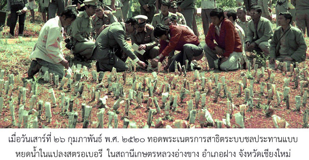 จากนั้นทอดพระเนตรการสาธิตระบบชลประทานแบบหยดน้ำในแปลงสตรอเบอรี ที่เป็นระบบการใช้น้ำในแปลงเพาะปลูกแบบประหยัดที่สุด ต่อจากนั้น ทอดพระเนตรระบบการส่งน้ำด้วยลำรางไม้ไผ่ในพื้นที่เพาะปลูกตามเชิงดอย โดยปล่อยน้ำให้ไหลไปตามระดับความลาดชันของไหล่เขาโดยไม่ต้องใช้เครื่องมือทุ่นแรงช่วย