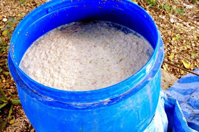 2.จากนั้นเอากากน้ำตาล จุลินทรีย์ น้ำซาวข้าวที่เตรียมไว้ผสมลงในถังหมักคนให้เข้ากัน หมักทิ้งไว้ 14 วัน กรองเอาแต่น้ำก็จะได้ปุ๋ยยูเรียน้ำที่ต้องการ