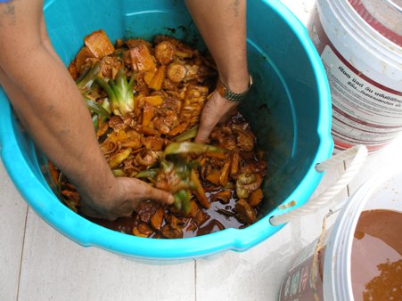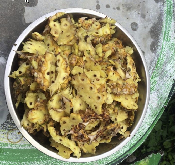 1.นำสับปะรดมาสับเป็นชิ้นเล็กๆเอาทั้งเปลือกและถั่วเหลืองลงในถังหมัก