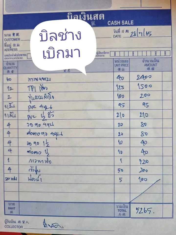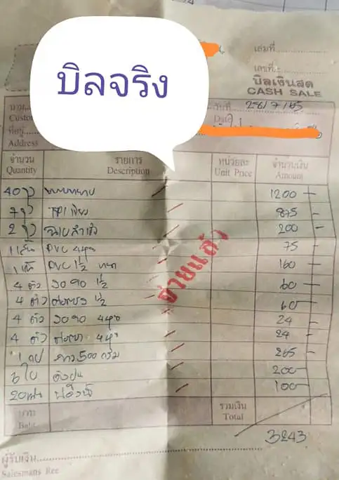 จ้างช่างเหมาค่าแรง แล้วไม่ได้ไปดูงาน ก็จะเป็นแบบนี้ (ช่างลืมเก็บบิลจริงไป เราเห็นทิ้งที่หน้างาน) ปกติเราจะเข้าไปเช็คงานทุกวันตอนเย็น แล้วซื้อของเข้าไปให้ ถามทุกวันว่าช่างต้องซื้ออะไรไหมจะได้ซื้อเข้าไป บางรอบช่างก็บอกไม่มี แต่พอกลางวันเราไปทำงาน ช่างอยากใช้ของด่วนก็ไปซื้อเอง เราก็จ่ายก็เข้าใจบางทีมันมีของต้องใช้ด่วน ราคาบวกเพิ่มมันอาจไม่ได้มากมาย แต่บวกราคามาแบบนี้ก็แหม
