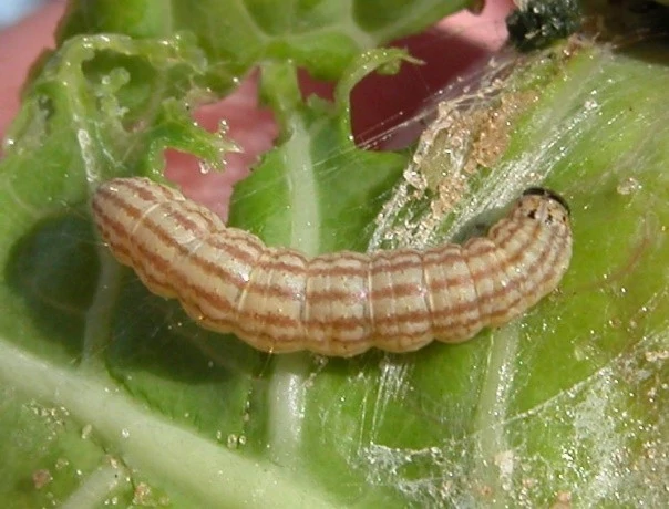 หนอนมีลำตัวยาวเรียวหัวท้ายแหลมส่วนท้ายมีปุ่มยื่นออกเป็น 2 แฉก สีเขียวอ่อน เทาอ่อน หรือเขียวปนเหลือง เมื่อถูกตัวจะดิ้นและทิ้งตัวลงดินโดยการชักใย หนอนเข้าดักแด้ตามใบพืชโดยมีใยปกคลุมหนอนใยผักกัดกินใบและยอดผัก ตั้งแต่เริ่มงอกจนถึงระยะ เก็บเกี่ยว พบการทำลายตามแหล่งปลูกผักคะน้าเป็นการค้าทั่วไป มักแพร่ระบาดในช่วงฤดูร้อน และฤดูหนาวโดยเฉพาะอย่างยิ่งในแหล่งปลูกภาคกลาง