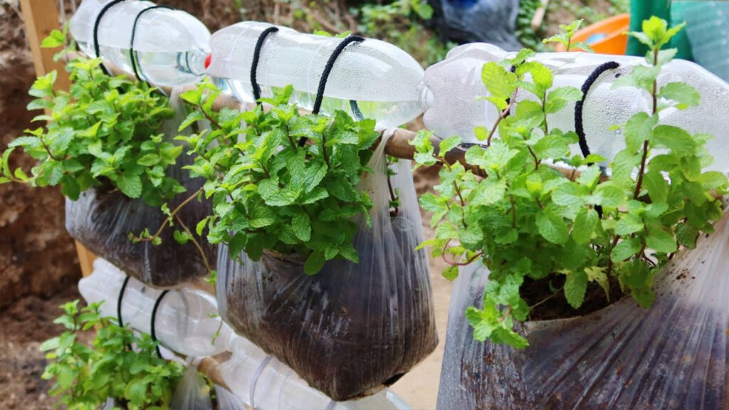 DIY วิธีปลูกสะระแหน่ในถุง และระบบรดน้ำหยดจากขวดพลาสติก
