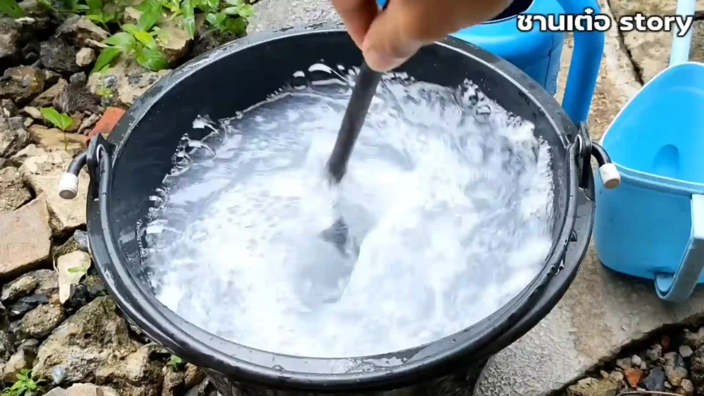– เทผงซักซอก ประมาณ 1 อุ้งมือ ต่้อน้ำเปล่า 10-15 ลิตร