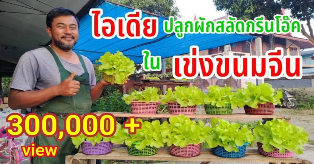 ปลูกผักสลัดกรีนโอ๊คปลอดสารในเข่งขนมจีน | ไอเดียปลูกผักแบบพื้นที่น้อยและช่วยประหยัดต้นทุน