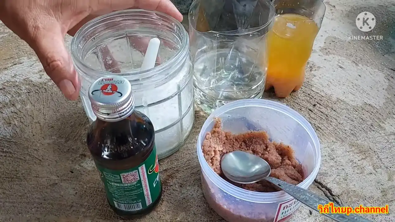 เทเครื่องดื่มชูกำลัง 1 ช้อนโต๊ะผสมไปในน้ำเปล่า ตามด้วยผงชูรส 1 ช้อนโต๊ กระปิ 1 ช้อนโต๊ คนให้เข้ากัน